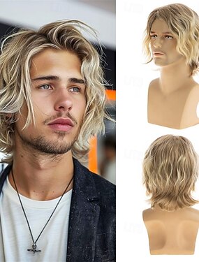 parrucca bionda corta e riccia da uomo, parrucca biondo sporco dall'aspetto naturale per feste quotidiane