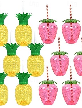 Set di 6 bicchieri di plastica a forma di ananas con cannucce, bicchieri con motivo a fragola, adatti per feste di compleanno a tema hawaiano luau, decorazioni per feste estive tropicali in spiaggia,