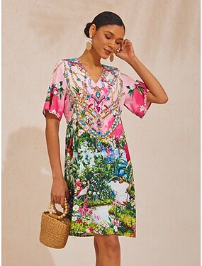 Per donna Insieme del vestito Abito a trapezio Elegante Vacanza Floreale Grafico Stratificato Stampato Abito Midi Manica 3/4 Girocollo Quotidiano Rosa Rosso Estate Primavera Vestibilità regolare