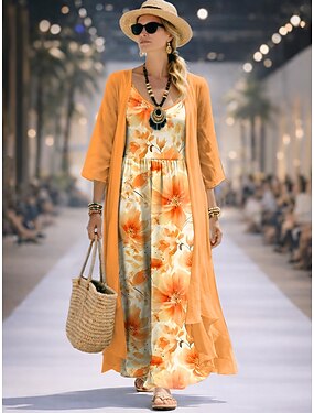 Per donna Insieme del vestito Abito a trapezio Elegante Vacanza Floreale Grafico Stratificato Stampato Abito maxi Manica 3/4 Scollo a V Quotidiano Spiaggia Rosso Viola Arancione Estate Primavera
