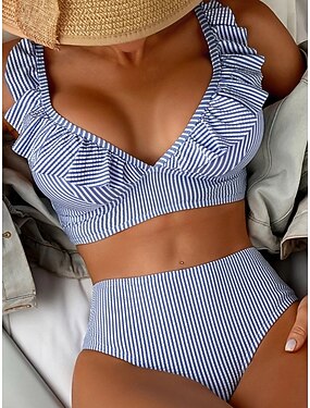Per donna Costumi da bagno Bikini Due pezzi Vita alta Costume da bagno Snello Senza schiena Vacanza Abbigliamento da Spiaggia A righe All'americana Senza Maniche Costumi da bagno