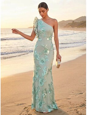 Tubino Colonna Lunghezza al pavimento Abito da Sera Abito formale Elegante Floreale Senza Maniche Monospalla Festa in giardino Matrimonio Raso Tulle con Pizzo Fiore ricamato Ricamo