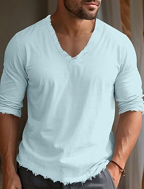 Per uomo Maglietta Maglietta in lino Manica Lunga Scollo a V Estate Primavera Tinta unica Semplice Testurizzato Quotidiano Casual Stile da Strada Puro Casuale All'aperto Streetwear Blu azzurro cielo