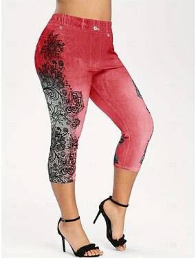 Per donna 3/4 Collant Leggings comodi Collant Atletico Lunghezza al polpaccio Vita Alta Floreale Stampa Comodo Sollevamento glutei Controllo addominale Yoga Casual Quotidiano Rosso scuro Blu marino