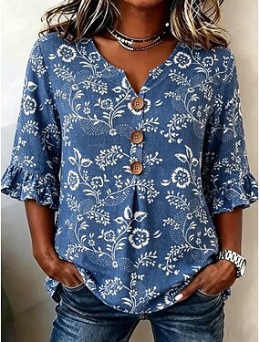 Per donna Camicia Tunica Top estivi Bottoni Ombre Grafico Vacanza Vintage Quotidiano Manica Lunga Scollo a V Top lunghi Casuale Quotidiano Ferie Blu Verde Estate Primavera