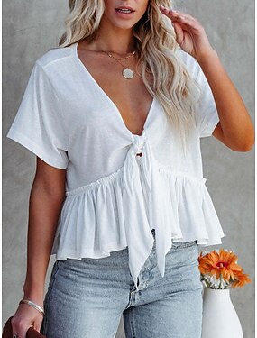 Per donna Camicia Blusa Camicia di cotone Finto cotone e lino Nodo frontale Volant Semplice Elegante Classico Moderno Manica Corta Scollo a V Top Regolari Quotidiano Ferie Uscire Nero Bianco Rosa