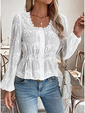 Camicia Camicia in pizzo Blusa Camicia di pizzo bianco Per donna Nero Bianco Liscio Pizzo Tunica fluente Strada Giornaliero Di tendenza A V Standard S