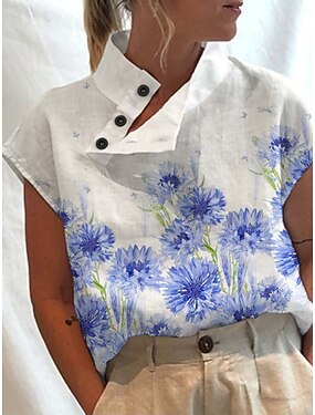 Per donna Camicia Blusa Camicia in finto lino Bottoni Floreale Grafico Elegante Classico Moderno Manica Corta Collo alla coreana Top Regolari Quotidiano Ferie Uscire Blu Bianco Estate Primavera