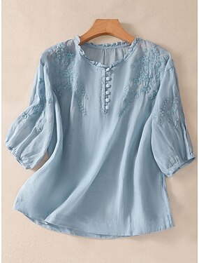 Per donna Camicia Blusa Finto cotone e lino Arricciato Ricamato Stampato Semplice Attivo Elegante Manica 3/4 Scollo a V Top Regolari Top corti Quotidiano Ferie Uscire Bianco Estate Primavera