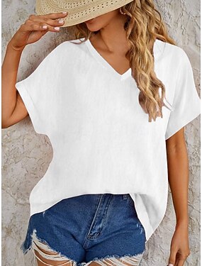 Per donna Camicia Blusa Finto cotone e lino Semplice Elegante Classico Moderno Manica Corta Scollo a V Top Regolari Quotidiano Ferie Uscire Blu Nero Bianco Rosa Marrone Estate Primavera