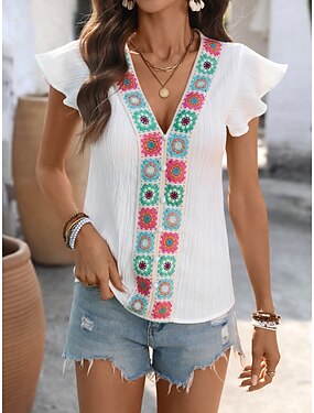Per donna Blusa Ricamato Floreale Vacanza Vintage Etnico Manica Corta Scollo a V Top Regolari Quotidiano Bianco Estate Primavera