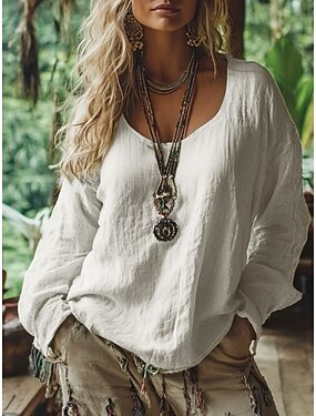 Per donna Blusa Finto cotone e lino Volant Tinta unica Elegante Casual Manica Lunga Scollo a V Top Regolari Quotidiano Blu Bianco Giallo Rosa Estate Primavera Autunno
