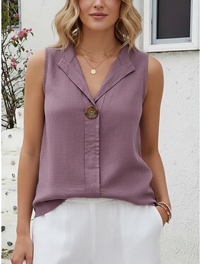 Per donna Blusa Finto cotone e lino Bottoni Semplice Casual Senza Maniche Scollo a V Top Regolari Quotidiano Ferie Uscire Blu Vino Viola Verde Estate Primavera