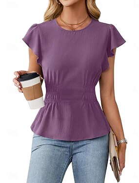 Per donna Blusa Finto cotone e lino Arricciato Tinta unica Essenziale Casual Manica Corta Girocollo Top Regolari Quotidiano Blu Rosa Blu marino Viola Verde Estate Primavera