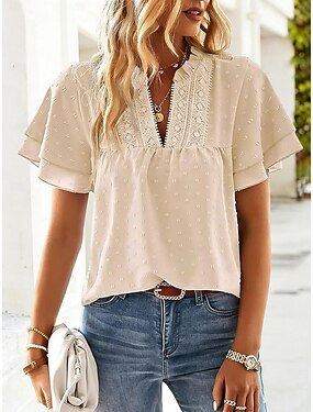 Per donna Blusa Pizzo Volant Tinta unica Elegante Essenziale Casual Manica Corta Scollo a V Top Regolari Quotidiano Blu Nero Bianco Vino Rosso Estate Primavera