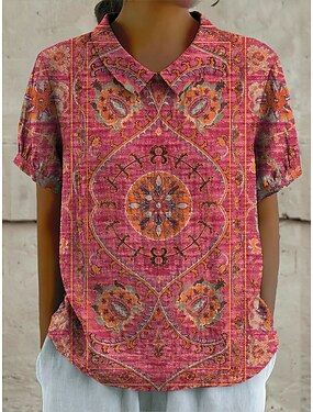 camicetta da donna con bottoni, stampa grafica, geometrica, bohémien, vacanza, quotidiano, manica corta, tessuto con texture, colletto, normale, top, quotidiano, vacanza, uscite, rosso, estate,