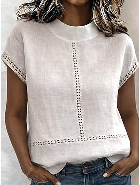 Per donna Blusa Finto cotone e lino Arricciato Pizzo Semplice Attivo Casual Manica Corta Girocollo Top Regolari Quotidiano Abbigliamento casual alla moda Ferie Bianco Estate Primavera