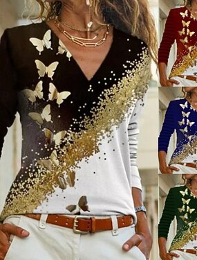Per donna Blusa Stampato Farfalla Elegante Moderno Manica Lunga Scollo a V Top Regolari Ferie Uscire Blu Nero Rosso Verde Autunno
