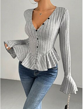 Per donna Blusa Volant Bottoni Tinta unica Elegante Casual Manica Lunga Scollo a V Top Regolari Quotidiano Blu Nero Rosa Vino Grigio Primavera Autunno Inverno