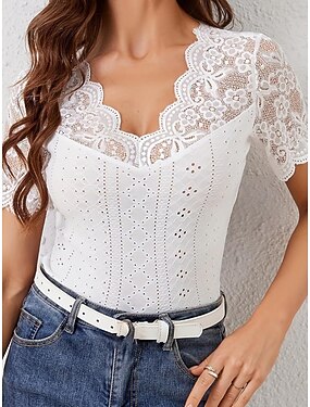 Per donna Top con cuciture in pizzo Blusa Pizzo Patchwork Tinta unica Elegante Essenziale Casual Manica Corta Scollo a V Top Regolari Quotidiano Blu Bianco Rosa Estate Primavera