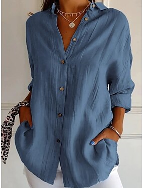 Per donna Camicia Abbottonare Blusa Finto cotone e lino Bottoni Tinta unica Essenziale Casual Manica Lunga Colletto a Camicia Top Regolari Quotidiano Blu Bianco Rosa Primavera Autunno