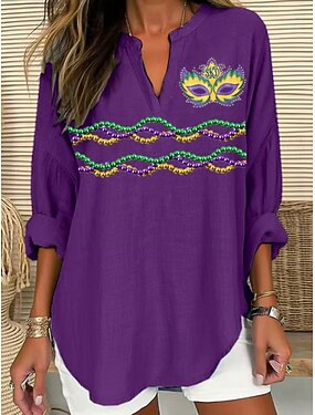 Blusa da Donna Mardi Gras in Lino Leggera e Traspirante Grafica Vintage Stile Quotidiano Maniche Lunghe Collo a V Top Regolari per Festività Quotidiane Stampa Blu Nero Bianco Giallo Viola Estate