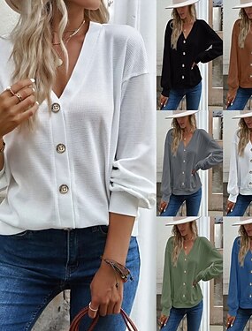 Per donna Blusa con texture Maglietta Bottoni Semplice Moda Moderno Manica Lunga Scollo a V Top corti Quotidiano Uscire Nero Vino Verde militare Beige Grigio Autunno Inverno