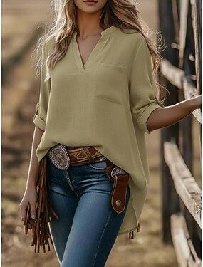 Per donna Blusa Finto cotone e lino Tasca Tinta unica Elegante Casual Manica Lunga Scollo a V Top Regolari Quotidiano Ferie Blu Nero Bianco Rosa Estate Primavera