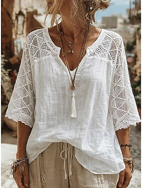 Per donna Blusa Uncinetto Tinta unica Elegante Casual Manica 3/4 Scollo a V Top Regolari Quotidiano Bianco Estate Primavera Autunno