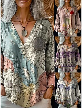 Blusa Boho da donna simile al lino traspirante leggera grafica floreale vintage stilosa maniche lunghe scollo a V top regolari giallo rosa blu navy estate primavera