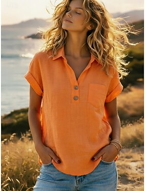 Per donna Camicia Blusa Finto cotone e lino Bottoni Semplice Casual Manica Corta Scollo a V Top Regolari Quotidiano Blu Rosa Viola Verde Cachi Estate