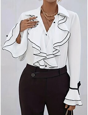 Per donna Elegant Top in raso Blusa Top in chiffon Arricciato Volant Patchwork Tinta unica Elegante Casual Spiaggia Manica Lunga Scollo a V Top Regolari Quotidiano Ferie Uscire Bianco Vino Primavera