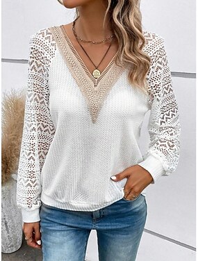 Per donna Blusa Pizzo Patchwork Tinta unica Elegante Casual Manica Lunga Scollo a V Top Regolari Quotidiano Bianco Primavera Autunno Inverno