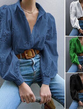 Per donna Blusa Ricamato Bottoni Semplice Casual Manica 3/4 Scollo a V Top Regolari Nero Bianco Primavera Autunno