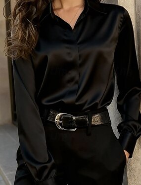 Per donna Camicia Elegant Elegante Top in raso Arricciato Patchwork Bottoni Tinta unica Semplice Elegante Vintage Quotidiano Manica Lunga Colletto a Camicia Top Regolari Quotidiano Lavoro Ferie Nero
