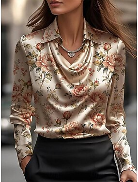 Per donna Camicia Elegant Top in raso A calotta di seta Stampato Drappeggiato Floreale Elegante Casual Manica Lunga Scollo a Cascata Top Regolari Quotidiano Lavoro Ferie Champagne Verde Primavera