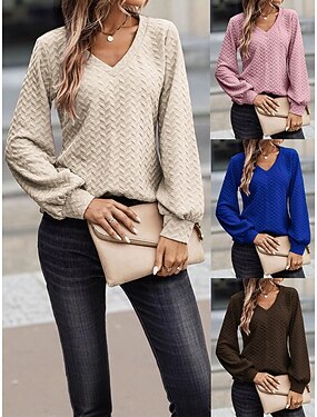 Per donna Blusa Tinta unica Casual Manica Lunga Scollo a V Top Regolari Blu Nero Bianco Rosa Primavera Autunno