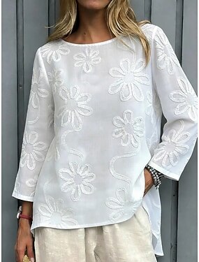 Per donna Camicia Camicia casual Camicie ricamate Camicetta con volant Floreale Semplice Elegante Bohemien Manica 3/4 Scollo a V Top Regolari Quotidiano Ferie Nero Bianco Rosa Vino Azzurro cielo