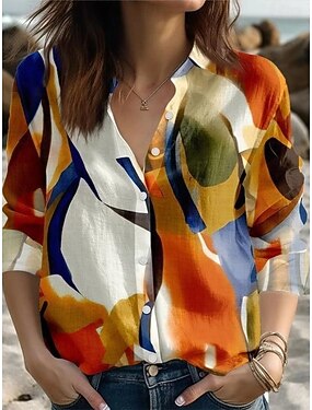 Per donna Camicia Bottoni Stampato Geometrico Attivo Quotidiano Elegante Manica Lunga Colletto a Camicia Top Regolari Quotidiano Ferie Bianco Arancione Estate Primavera