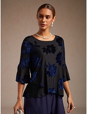 Per donna Top Eleganti Floreale Elegante Manica a Volant Girocollo Quotidiano Ospite di nozze Blu marino Primavera, Autunno, Inverno, Estate