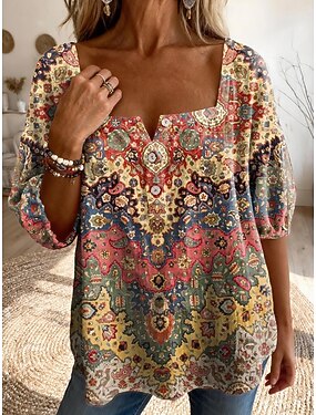 Per donna Blusa Stampato Grafico Geometrico Vintage Quotidiano Elegante Mezza Manica Collo quadrato Top Regolari Casuale Quotidiano Blu Giallo Rosso Arancione Estate Primavera