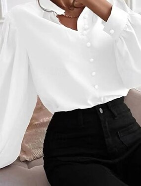 Per donna Blusa Volant Bottoni Tinta unica Elegante Casual Manica Lunga Scollo a V Top Regolari Quotidiano Bianco Primavera Autunno