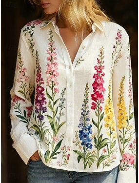 Per donna Camicia Abbottonare Blusa Finto cotone e lino Stampato Fiore Casual Manica Lunga Colletto a Camicia Top Regolari Quotidiano Ferie Uscire Blu Nero Bianco Cachi Grigio Estate