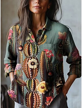Camicia da donna in lino simile traspirante leggera grafica floreale geometrica elegante moderna casual maniche lunghe con colletto camicia per uso quotidiano vacanze stampa nera blu viola arancione