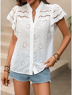 Per donna Blusa Traforato Tinta unica Elegante Quotidiano Casual Manica Corta Scollo a V Top Regolari Quotidiano Bianco Estate Primavera