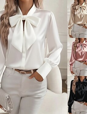 Per donna Camicia in raso Camicia elegante Blusa Fiocco Tinta unica Semplice Elegante Essenziale Casual Manica Lunga Scollo a V Top Regolari Quotidiano Lavoro Feste Nero Bianco Rosa Cachi Primavera