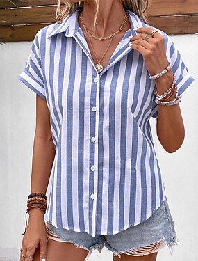 Per donna Camicia Estiva Camicia casual Blusa Arricciato Bottoni A righe Quotidiano Elegante Casual Manica Corta Manica a pipistrello Collo ripiegato Top Regolari Quotidiano Ferie Abbigliamento mare