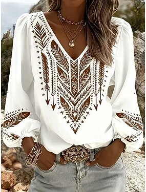 Per donna Camicia Grafico Geometrico Paisley Bohemien Vacanza Vintage Manica Lunga Scollo a V Top Regolari Quotidiano Ferie Uscire Blu Bianco Marrone chiaro Verde Estate Primavera