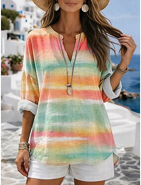 Blouse da donna a maniche lunghe orlo asimmetrico grafica a righe elegante spiaggia maniche corte scollo a V top regolari stampa quotidiana rosa blu grigio primavera autunno