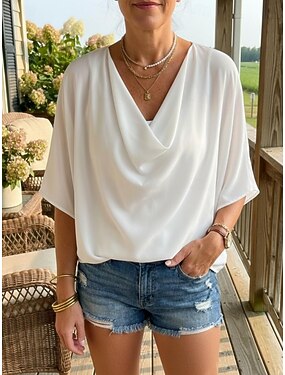Per donna Blusa Top Eleganti Arricciato Tinta unica Semplice Elegante Manica 3/4 Manica a pipistrello Scollo a Cascata Top Regolari Quotidiano Lavoro Nero Bianco Giallo Rosa Azzurro cielo Estate